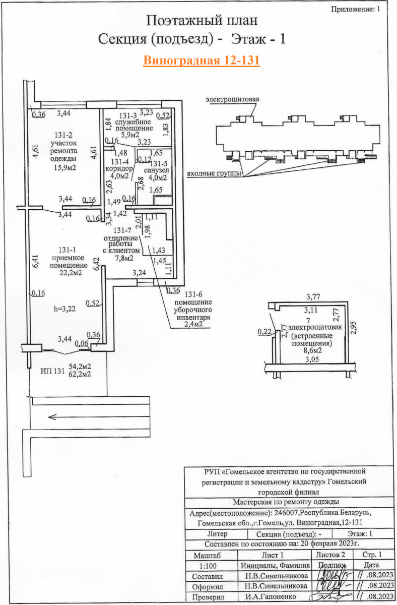 Изолированное помещение с инв. №350/D-368596, общей площадью 62,2 кв. м., назначение – Помещение бытового обслуживания населения, наименование – Мастерская по ремонту одежды. Адрес: Гомельская обл., г. Гомель, ул. Виноградная, 12-131. Информация о земельном участке: расположено на земельном участке с кадастровым номером 340100000002007050 общей площадью 0,1574 га (право аренды). Местоположение (адрес): Гомельская обл., г. Гомель, ул. Виноградная, 12. Целевое назначение земельного участка: для строительства и обслуживания многоквартирного жилого дома и изолированных помещений, не относящихся к жилому фонду |