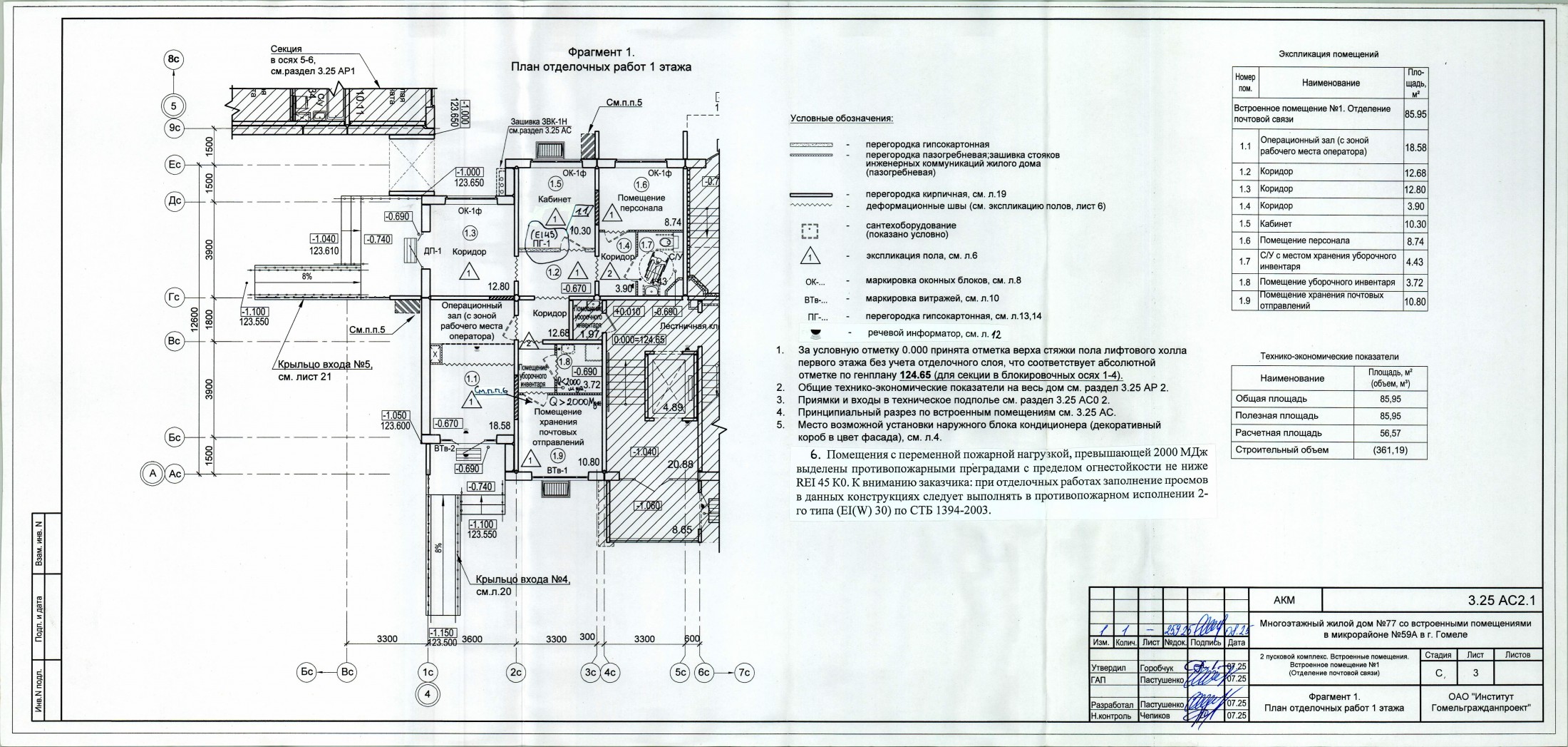 2.5.2.1. Встроенное нежилое помещение №1 (Отделение почтовой связи) общей площадью - 85,95 кв.м. (операционный зал-18,58 кв.м., коридор-29,38 кв.м., кабинет-10,30 кв.м., помещение персонала-8,74 кв.м., санузел – 4,43 кв.м., помещение уборочного инвентаря– 3,72 кв.м., помещение хранения почтовых отправлений-10,8 кв.м.);