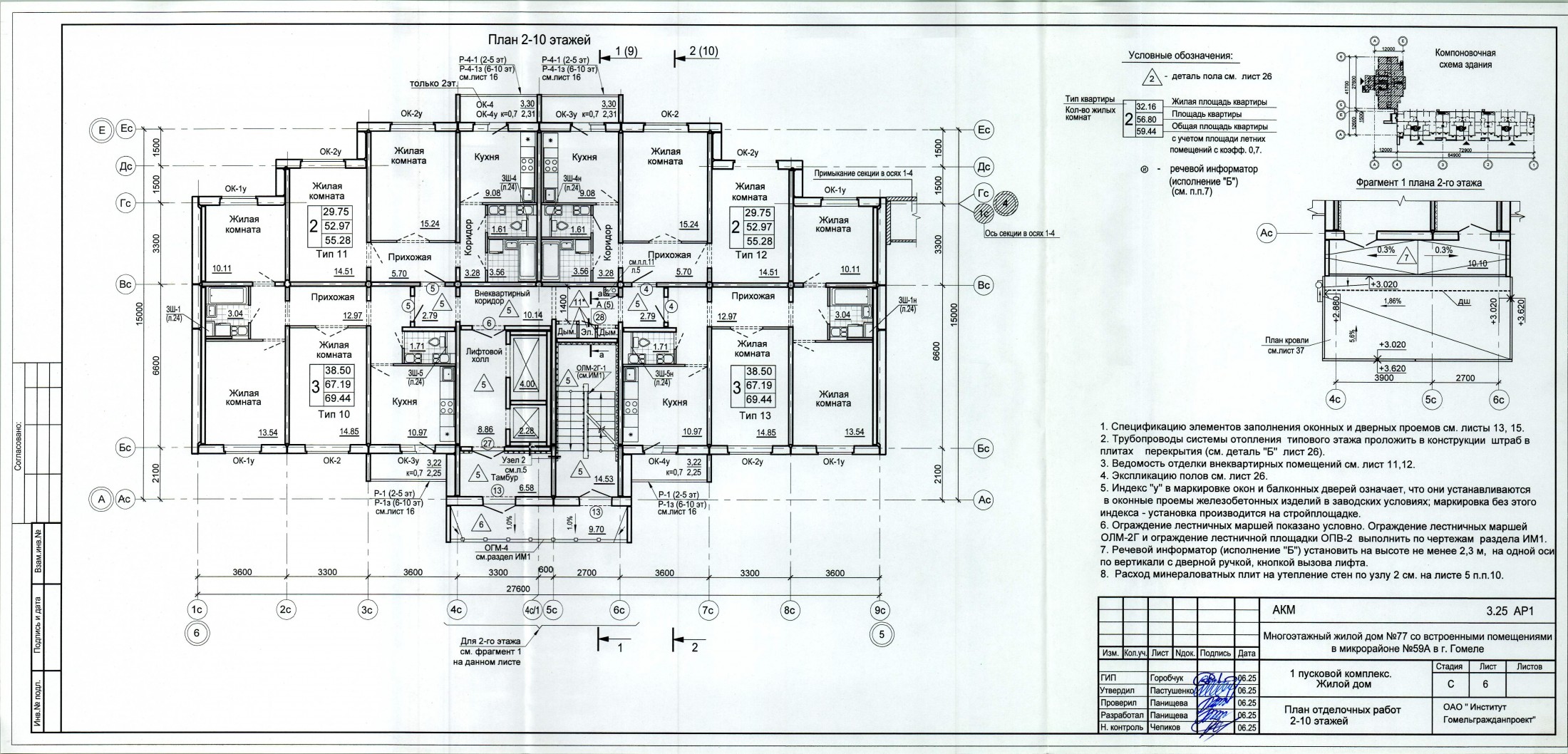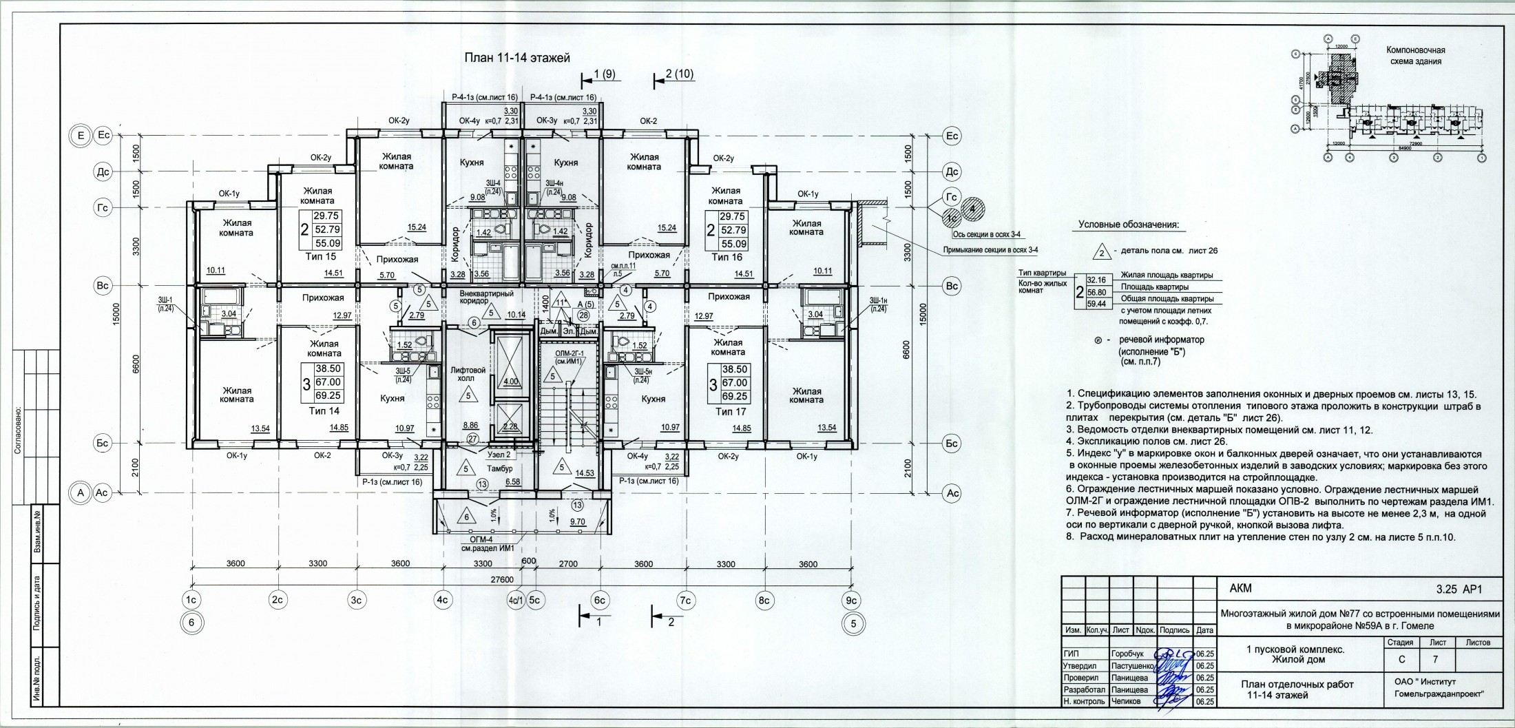 2.1. Объект: 4-секционный многоквартирный жилой дом 11-11-11-14 этажей со встроенными помещениями на первом этаже, расположенными в 11-ти этажных секциях; с совмещенной кровлей, с техническим подпольем, без чердака (в секциях в осях «1-4»); с техническим подпольем и теплым чердаком в секции в осях «5-6». Жилой дом запроектирован без мусоропровода. Жилой дом расположен в микрорайоне № 59А Советского административного района г. Гомеля.